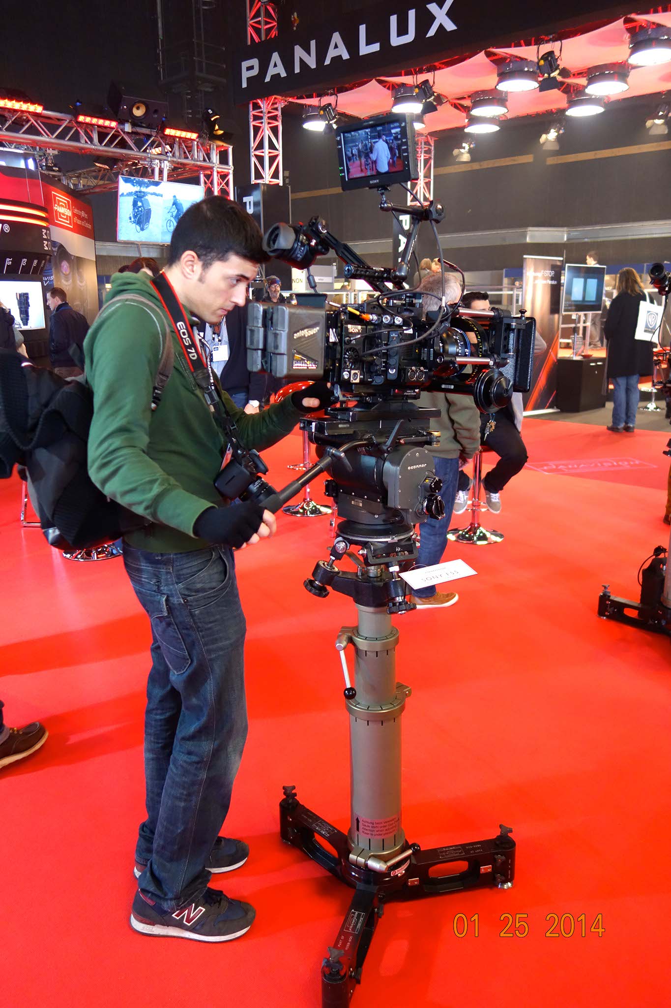 We took a slow stroll around the booths and saw the RED Dragon on display, working in 6K, wireless focus and zoom and touch-control monitors. The Amira from ARRI. The Panavision motorized camera axis and their new Primo V Series, ARRI/ZEISS Master Anamorphics, Cooke’s new Anamorphic primes and the Angenieux 25-250mm PL DP Lens; the Mini Libra head from Camera Revolution, and the MoVi — the miniature remote stabilised Head that can be mounted on bicycles, motorcyles or hand held.