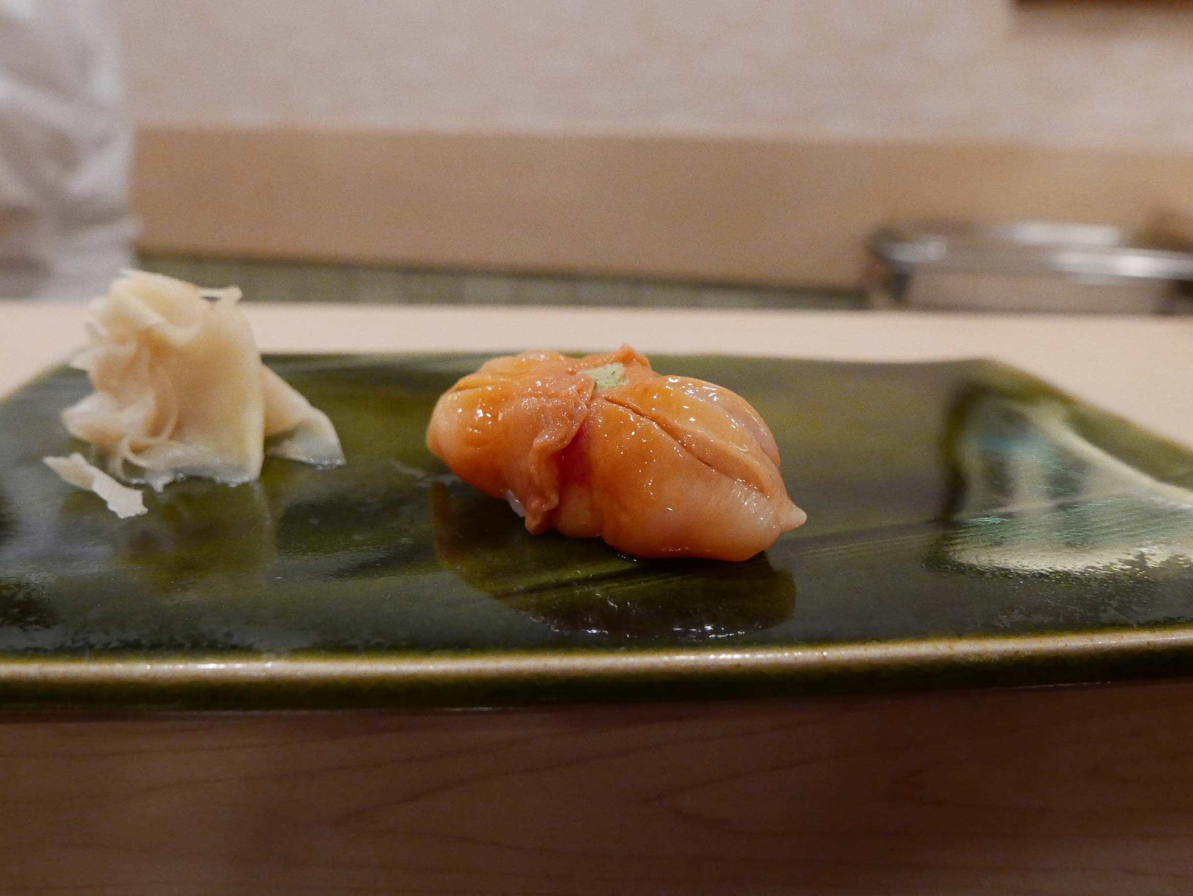 It is located in the posh Roppongi Hills development of real-estate tycoon Minoru Mori, called the Trump of Tokyo. Sushi maestro Takashi Ono presides over the 10 seats at the counter and 2 tables. He is the second son of Jiro Ono, the 90-year old dreamer of sushi. If we were naming films, this would be “Son of Jiro” — as good as, perhaps better than, the original.
