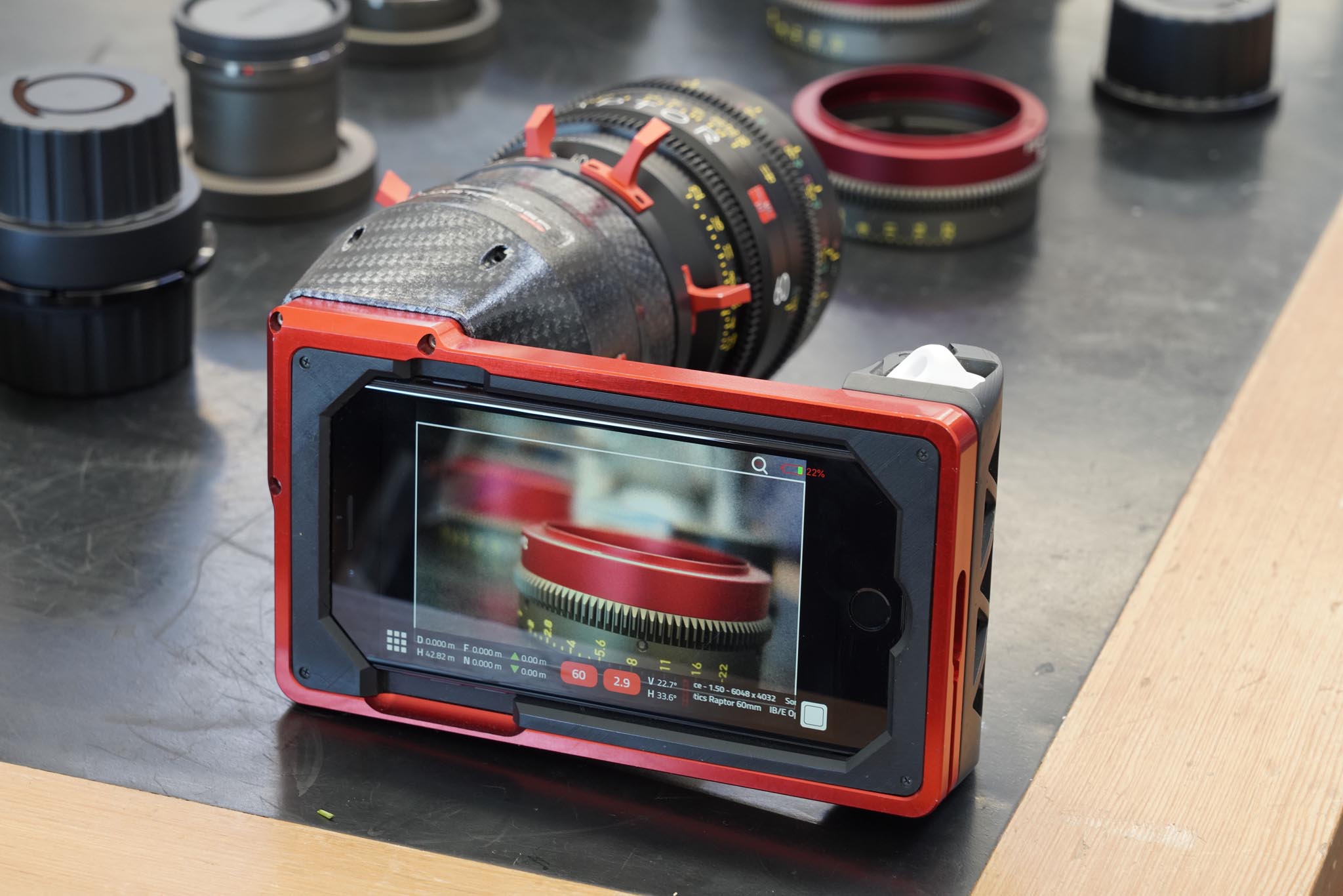 There were three different Director/DP Finders, all based on mobile devices with systems to capture a Super35 or FF image onto a smartphone’s sensor: Chemical Wedding’s Artemis Prime, based around an iPad; an iPhone-based finder in development from IB/E Optics; and a prototype designed for Padcaster by Jorge Díaz-Amador notable for being separable into two parts so that it’ll pack flat(ter) for transportation.