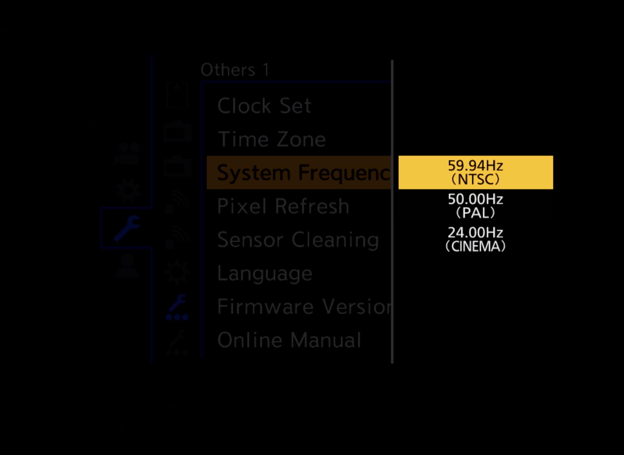 - The System Frequency choices are: 59.94Hz (NTSC) for 23.98p, 29.97p, 47.95p, 59.94i, 59.94p or 119.88p