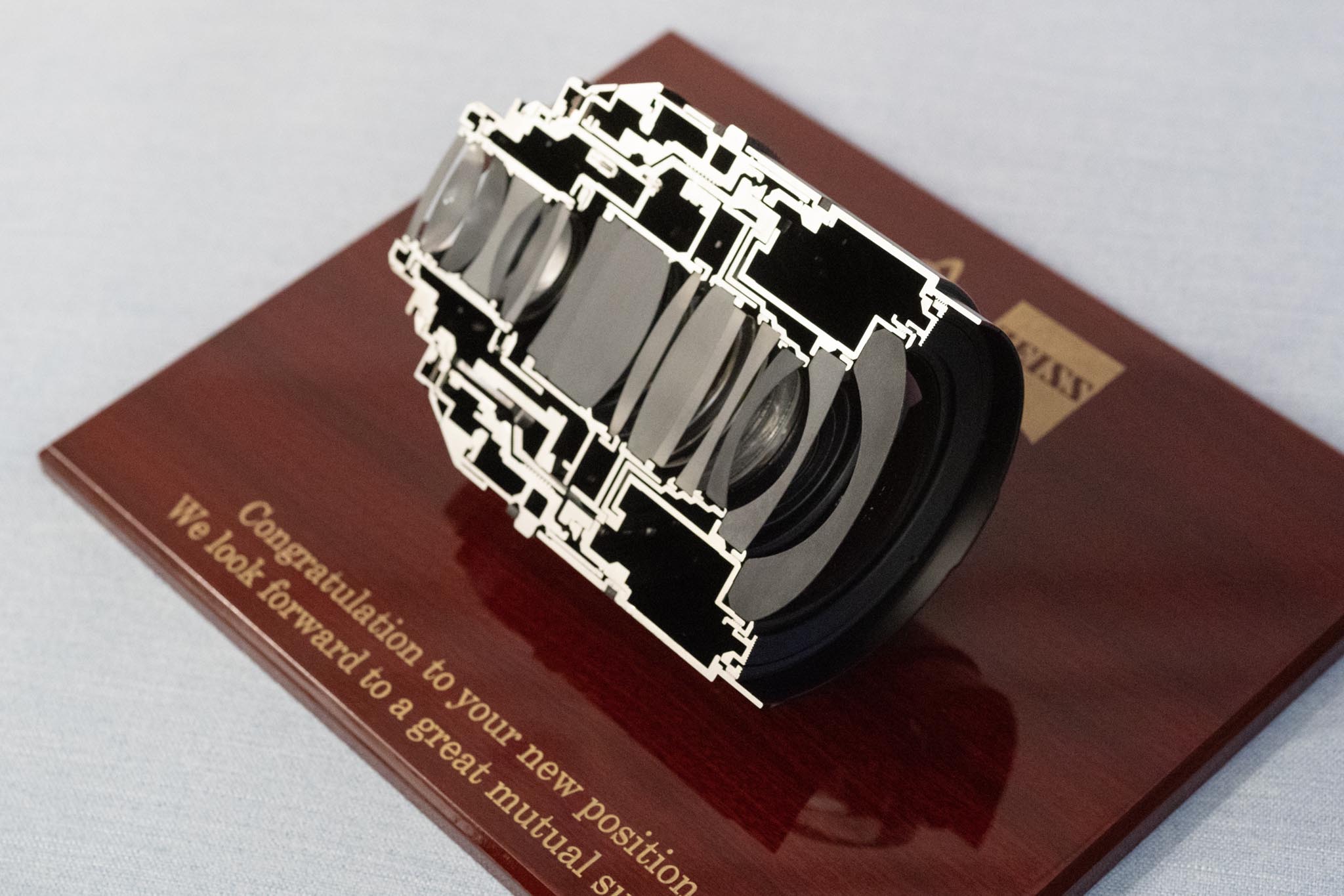 - Presenting SP 18 lens cutaway model. L-R: Simon Sommer, ZEISS Cinelens Trainer, Christian Cramer, Head of Global Service & Customer Support at ZEISS, Bong-hoon Lee, founder of Saeki P&C
