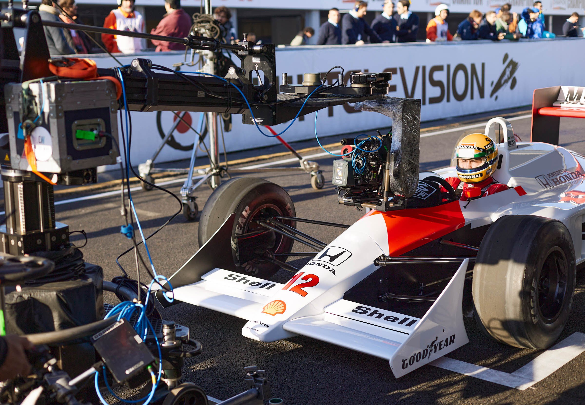 I had a Leica SL2 camera to take pictures during the creative scouting. It is a beautiful camera to have because it provides so much information. We started with those images, and I also got many references of Senna from the seventies, eighties, and nineties. Then we started to decide which look to have in each phase of his life. We ended up separating into four different phases. Phase one was his childhood in Brazil and the beginning of his career. Phase two involved Formula 3 and Ford in the UK, where he had arrived, alone, from Brazil trying to start his career. The third phase was when he went to Formula 1 and spent his time in Team McLaren. Most people, especially in Brazil, usually remember Senna with his red and white McLaren car. The fourth and last phase was when he was with Williams. The look changes because Formula 1 has also advanced, modernized with technology and pristine garages.