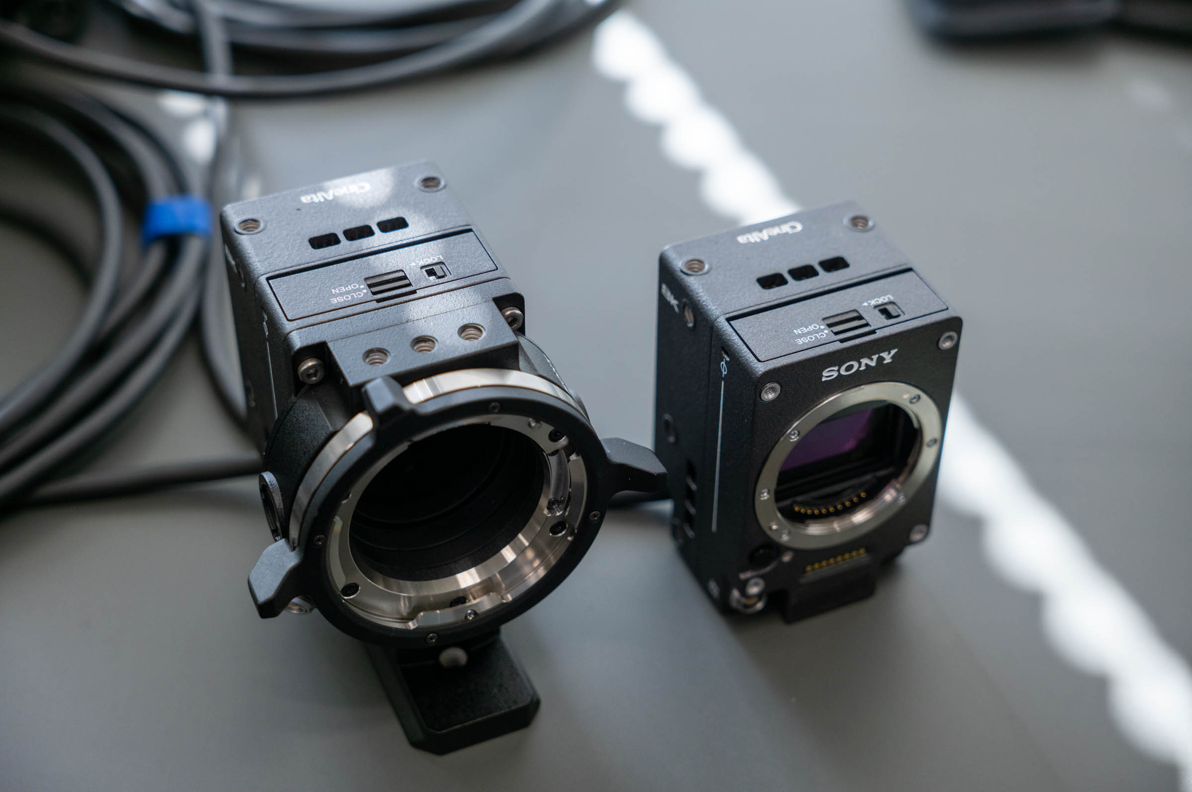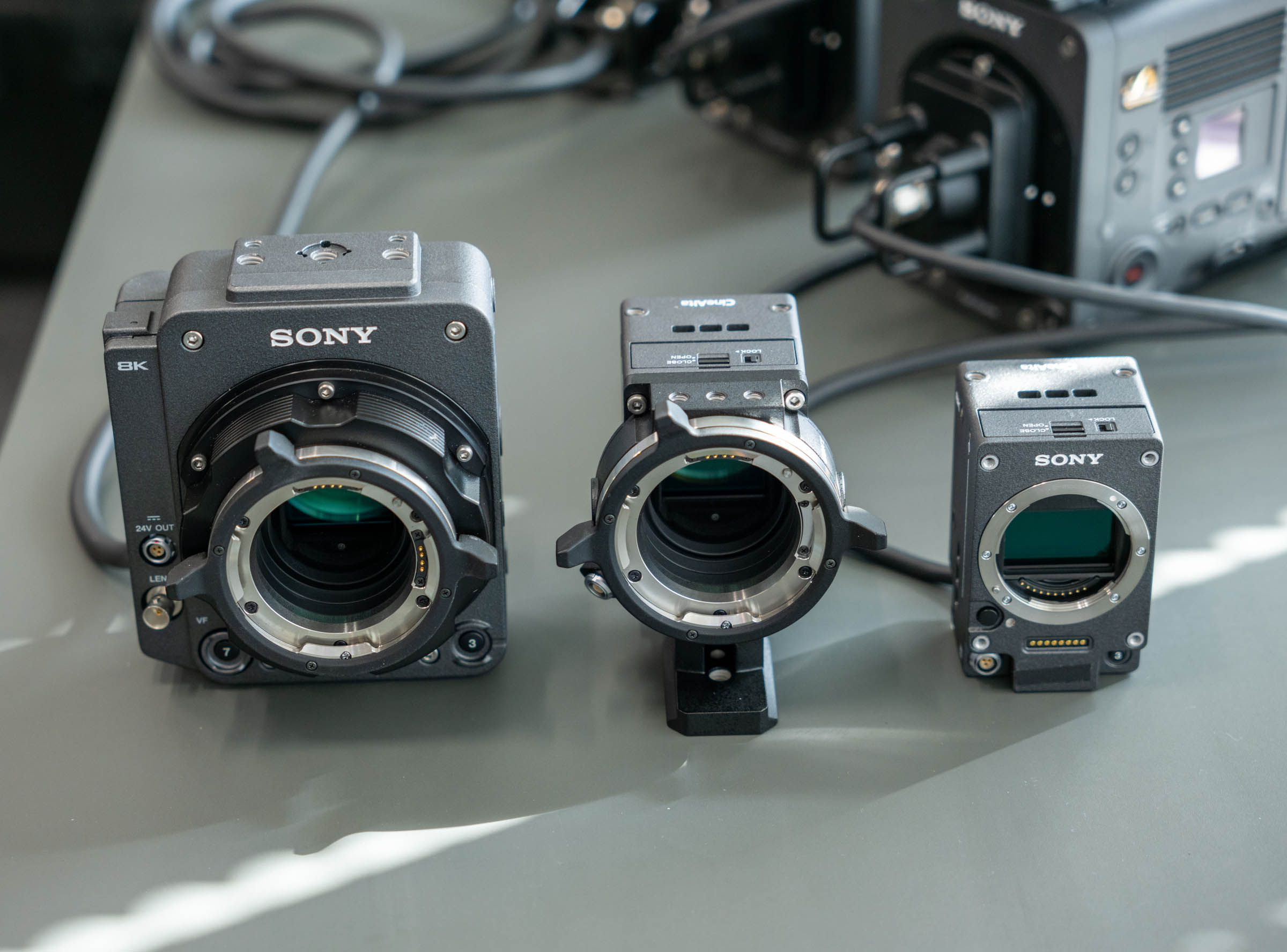 On the table, left to right: Original VENICE RIALTO, RIALTO Mini with PL Mount, RIALTO Mini with native E-mount.
