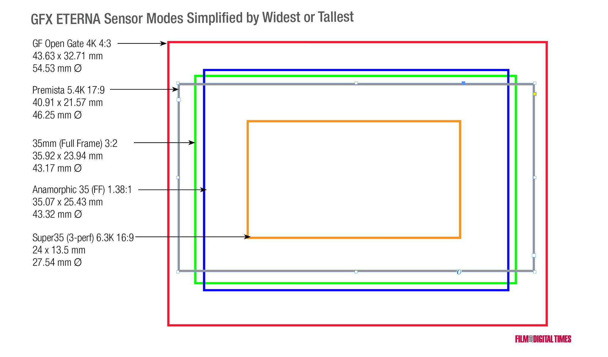 The GFX ETERNA 55 has the tallest digital sensor currently available in the Larger and Large Format category. In Open Gate, the sensor is 43.63 mm wide x 32.71 mm tall. The image diagonal is 54.53 mm—hence the name GFX ETERNA 55. The Open Gate aspect ratio is 4:3 (1.33:1) which is very close to IMAX 1.43:1.