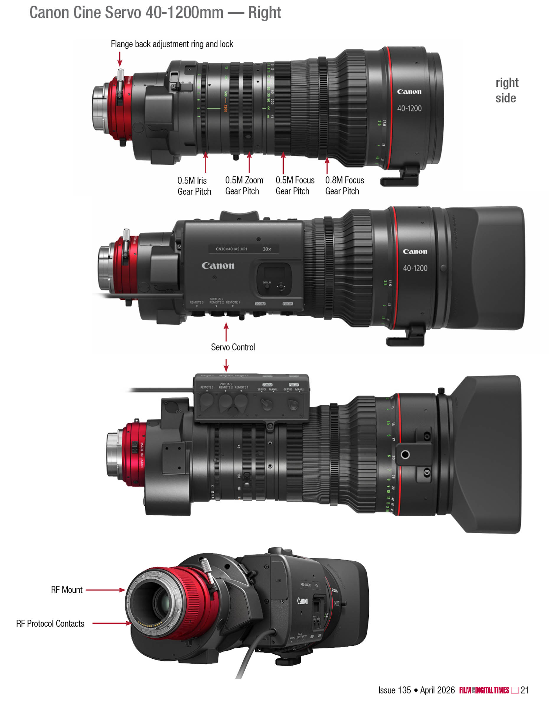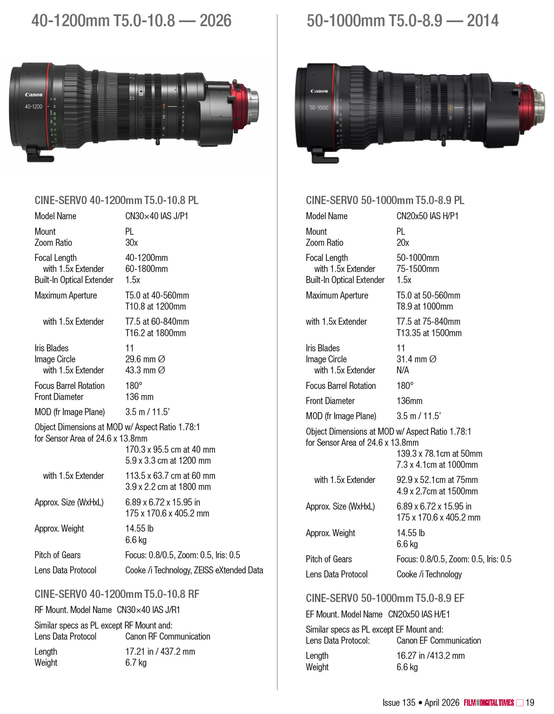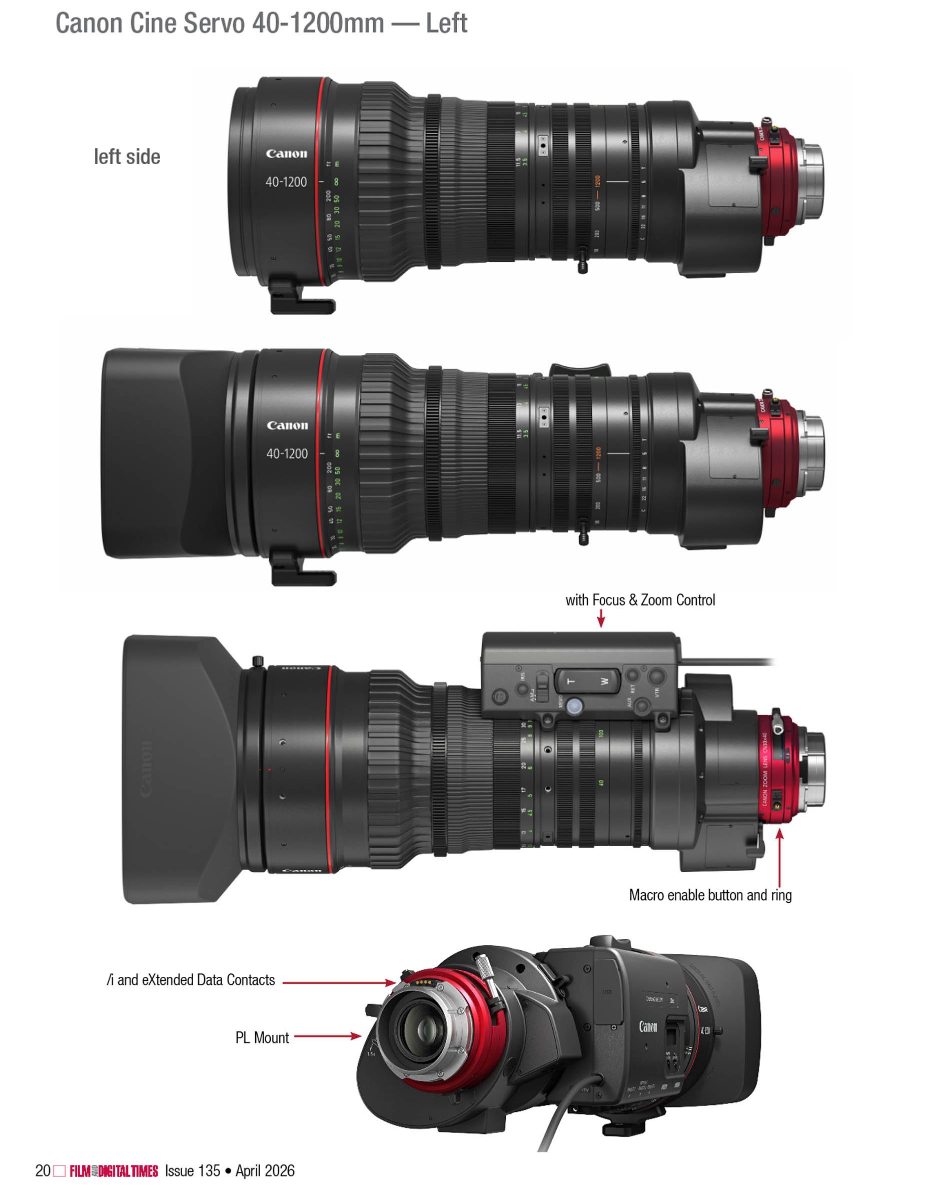 The new 40-1200mm zoom lens is lightweight, compact and versatile. It will be welcomed by sports, nature, documentary, broadcast and live event cinematographers. With the built-in 1.5x extender, it reaches 60-1800mm. This is a Super35 format zoom lens but because an extender enlarges the image circle, it’s also an expander to cover Full Frame. (Note: Canon is strict about image circle coverage—your mileage may vary.)